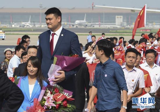 8月2日,北京申冬奥代表团成员姚明(中)、李妮娜等抵京后受到群众欢迎。当日,北京申冬奥代表团从吉隆坡返回北京。 新华社记者谢环驰摄