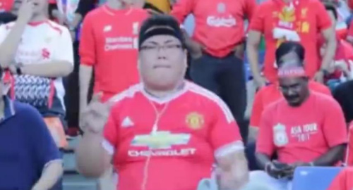 有低调加油的,也有高调助威的。今年7月,在利物浦与马来西亚全明星队的热身赛中,一位胖胖的曼联球迷听着音乐在看台上忘情热舞,丝毫没有考虑到他正坐在一群利物浦球迷中间。看到死敌球迷在自己的地盘“得瑟”,一位利物浦球迷看不下去,他上前摘掉了这位胖小伙儿的耳机,劝说他坐在座位上,并将一个马来西亚的黄色围巾披在了这位曼联球迷的肩膀上。小伙似乎意识到自己让利物浦球迷不爽了,坐在座位上露出十分尴尬的表情。