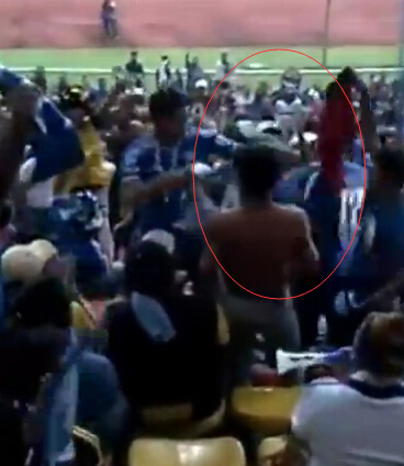 曼联球迷和他被扒掉的球衣。图片来源:视频截图。