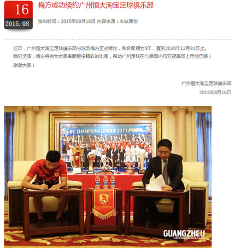 该微博还附有广州恒大淘宝足球俱乐部官方网站关于此事的文章。文章称,近日,广州恒大淘宝足球俱乐部与球员梅方正式续约,新合同期为5年,直到2020年12月31日止。