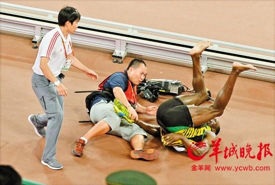博尔特鸟巢遭遇离奇"车祸" 被摄像小哥撞翻在地