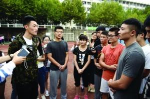 从赛场回归校园的王嘉男,昨天终于见到了阔别一个学期的同学。看着一个个同学跳跃着落到自己眼前的沙池内,王嘉男临时客串起“教练”,每一个同学跳完,他都拍着同学肩膀鼓励,并适时提出建议。几个男生跳完,围观的女生们等不及了,她们一再央求偶像能秀一下绝技,王嘉男推辞不过,便脱下外套,开始准备起跑。这时,躁动的军训场安静下来,只见一阵旋风吹来,还没来得及仔细看,王嘉男便腾空跳到了沙池里。