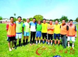 吴群立(左四)在美国与当地华人球友踢球。