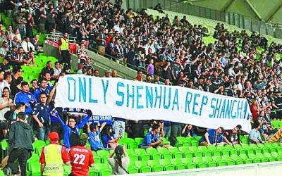 这些申花球迷在球场看台上,打出白底蓝字的标语:“只有申花代表上海”(见上图)。意思不言而喻,申花与上港同处于上海这座城市当中,但是他们认为只有申花才是上海的标志。