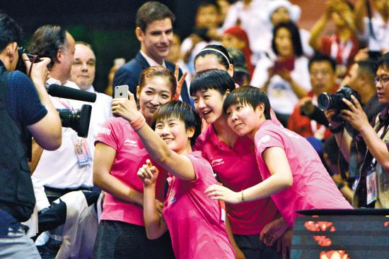 刘诗雯、丁宁、陈梦、朱雨玲(从左到右)夺冠后自拍庆祝 新华社发