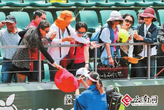 作为此次昆明网球公开赛上的最大牌球星之一,彭帅的首秀吸引了大批球迷到场观赛。在4日的首轮比赛中,彭帅以6:0、6:2轻松战胜对手田然成功晋级。昨日,彭帅与中国小将王雅繁展开第二轮角逐。彭帅以6:1轻松拿下首盘。第二盘比赛,还未完全从伤病中恢复最佳状态的彭帅一度被王雅繁迫近比分,好在心理素质过硬的彭帅顶住了压力,成功抢七胜出。