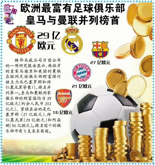 据毕马威公司日前公布的一项研究报告显示,西班牙的皇家马德里和英国的曼联在欧洲足球俱乐部财富排行榜上力压巴塞罗那和拜仁慕尼黑等豪门,排名并列第一。皇马和曼联两家俱乐部的财富值均为29亿欧元(约合人民币212亿元),紧跟其后的是巴塞罗那(27亿欧元)、拜仁慕尼黑(21亿欧元)和阿森纳(16亿欧元)。排名前十的俱乐部中有5支来自英超。