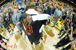 勒布朗·詹姆斯和凯里·欧文赛后相拥。@视觉中国
