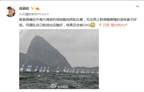 徐莉佳是伦敦奥运帆船激光镭迪尔级冠军,此次受肩伤困扰,徐莉佳在赛前不得不打封闭针出战。徐莉佳在微博中透露“挺着肩痛在外海大涌浪的场地跑完两轮比赛,无法用上肢调整缭绳的滋味真不好受。风摆乱自己航线也没跑好,结果还全被DSQ。”并配上了大哭的表情。