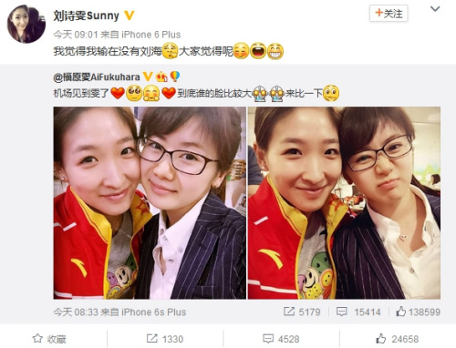 看到闺蜜的“挑衅”,刘诗雯迅速转发并感叹:“我觉得我输在没有刘海,大家觉得呢?”