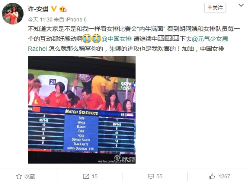 于是,许安琪的微博引得许多网友前来互动:“都在看,超级棒的”、“太紧张了、不忍直视,女排的姑娘们不容易”、“中国女排很强势,赞”。