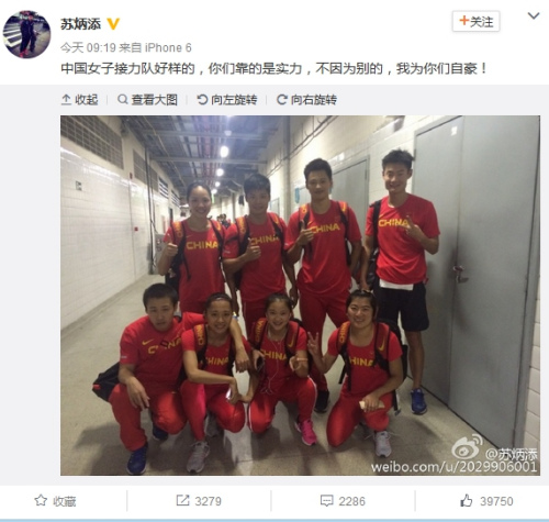 苏炳添在微博中对中国女子接力队的称赞代表了所有中国观众的心声,有网友勉励男子接力队“一定要加油,给世界看看”,有网友说“中国靠的都是实力,你们都最棒,加油”,还有网友说“真的很不公平,但是只要我们把自己变得更强,我们一定有机会的。加油,中国田径!”