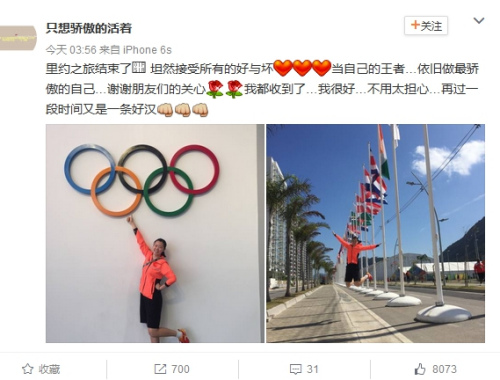 李雪芮说:“里约之旅结束了,坦然接受所有的好与坏,当自己的王者,依旧做最骄傲的自己。谢谢朋友们的关心,我都收到了,我很好,不用太担心,再过一段时间又是一条好汉。”