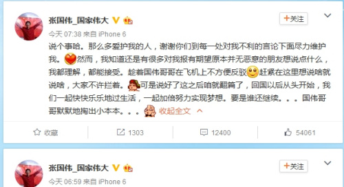 张国伟微博中写道:“说个事哈。那么多爱护我的人,谢谢你们到每一处对我不利的言论下面尽力维护我。然而,我知道还是有很多对我报有期望原本并无恶意的朋友想说点什么,我都理解,都能接受。趁着国伟哥哥在飞机上不方便反驳,赶紧在这里想说啥就说啥,大家不许拦着。可是说好了这之后咱就翻篇了,回国以后从头开始,我们一起快快乐乐地过生活,一起加倍努力实现梦想。要是谁还继续....。.国伟哥哥默默地掏出小本本....。.”
