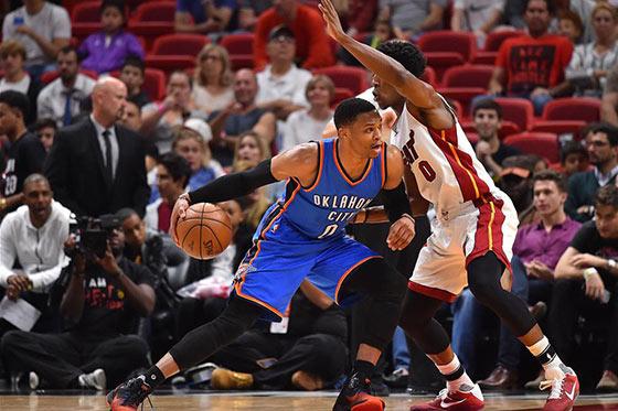 12月27日,雷霆队球员拉塞尔·威斯布鲁克(左)在热火队球员约什·理查德森的防守下带球进攻。当日,在2016-2017赛季NBA常规赛中,俄克拉荷马雷霆队客场以106比94战胜迈阿密热火队。 新华社/路透