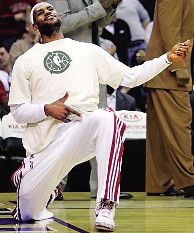 “小皇帝”詹姆斯除了会拍照还能搞出什么新花样出来?最近,“小皇帝”厌倦了拍照,迷上了敬礼,虽然手掌外翻的模样实在不敢恭维。昨天对阵奇才,玩性大发的“小皇帝”除了表演敬礼,还穿着环保球衣来了个“空弹吉他”,一脸陶醉,只是不知如果手中真的有一把吉他,“小皇帝”是会制造噪音呢,还是让球迷发现其实自己还蛮有音乐天赋?