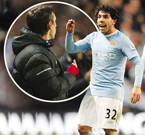 昨天,英格兰联赛杯半决赛首回合进行了一场曼彻斯特同城德比,结果曼城在第17分钟就先被对方队长吉格斯率先破门的不利形势下,凭借前曼联旧将、阿根廷国脚前锋特维斯在第40分钟的点球、第65分钟的头球,最终在主场以2:1险胜曼联。值得关注的是,绰号“野兽”的特维斯此番面对“抛弃”他的老东家红魔曼联首度进球,而且还是梅开二度。不过,反咬红魔快意复仇的“野兽”在进球后带有挑衅、示威意味的张狂庆祝动作,却引发了一场闹剧。
