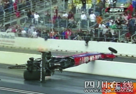 赛车突然失控,带着火星的零件和轮胎飞上看台,砸死了一位女孩……这是恐怖片《死神来了IV》中的一个经典镜头。美国西部时间上周日,在亚利桑那州凤凰城进行的一场赛车比赛中,与电影中相同的一幕发生了:老牌车手布朗的赛车在进行第一圈比赛时,车轮突然脱落,整辆车接着甩翻了90度,燃油也外泄起火,而赛车的轮子也从车体上脱落,飞上了看台,不偏不倚地打在了一名女观众的身上——造成了死亡的悲剧!