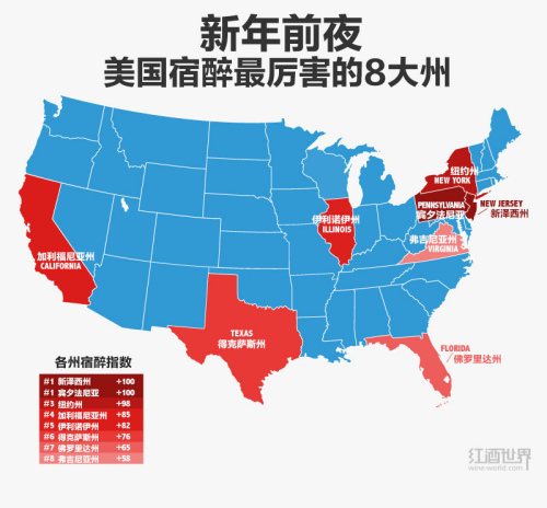 美国的vinepair网站通过谷歌排行榜公布的数据总结了新年前夜美国各州中的宿醉情况。这个数据显示,人口密度大的州,宿醉情况非常明显。下图是vinepair网站总结出的新年前夜美国宿醉最厉害的8大州。