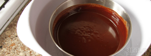 (2)将加热好的红酒奶油浇到巧克力上,使巧克力完全融化。
