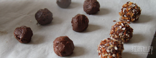 (2)为了防止巧克力融化,在上杏仁碎和椰子片之前,你可以将揉好的球形巧克力放入冰过的碗里。