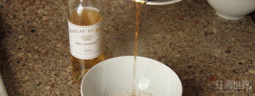 (1)准备酒浆。酒浆需要用葡萄酒和糖进行1∶1的调配。很多甜点师会用赤霞珠(Cabernet Sauvignon)干红葡萄酒来调配,但是我们这里用风味更加独特的黑皮诺来制作。另外,再加点波尔多著名的苏玳甜白葡萄酒效果会更佳。