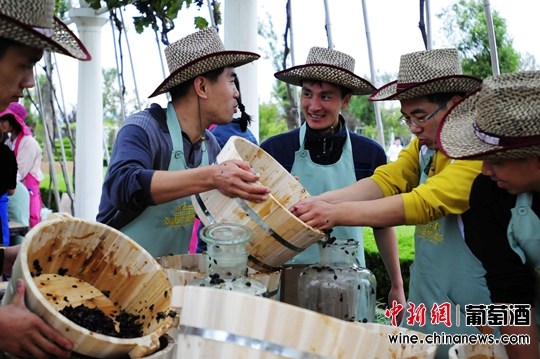 游客体验亲手酿葡萄酒