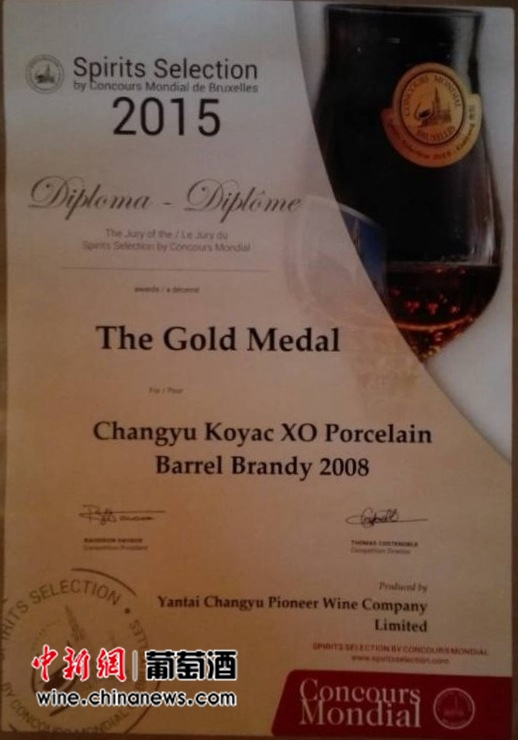 张裕可雅白兰地在布鲁塞尔国际烈酒大奖赛夺金