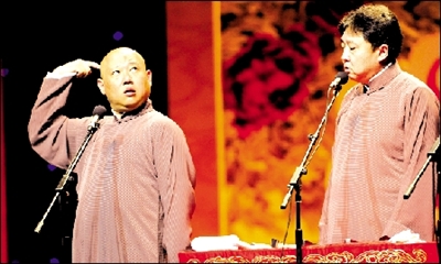 德云社的张德武、刘源以新编相声《成长的烦恼》开场,他们拿马诺在《非诚勿扰》中经典的“宁愿坐在宝马车里哭,也不坐在自行车后面笑”砸挂,现场效果很好。郭德纲、于谦登台合说了《夸住宅》,干脆利落的贯口赢得阵阵喝彩。走下台的郭德纲说,搭档于谦给了他不少惊喜,很多临时发挥的话接得很到位。