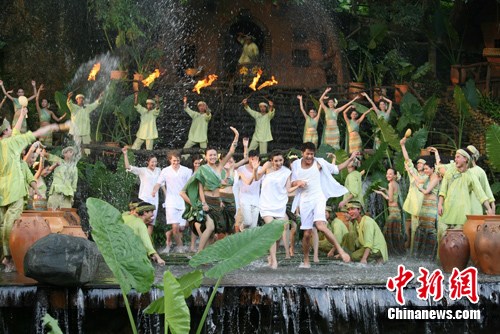 拍摄拍摄中,郭天王在水中秀起了舞技,并亲切地与槟榔谷景区的演员互动。(完)