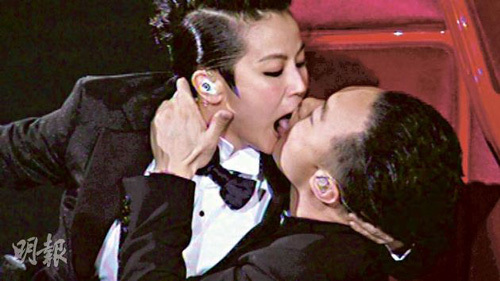 完成演出后,二人互相对望,然后激烈拥吻,镜头赫见有伸舌头的动作,而陈奕迅的手更摸住何韵诗的胸部,全场观众哗声四起;当时陈奕迅的太太徐濠萦及爱女康堤都在观众席目击整个过程。