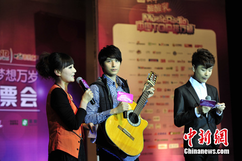 何洁坐轮椅穿"萌鞋"现身 携手严爵献唱拉票会(图)(2)