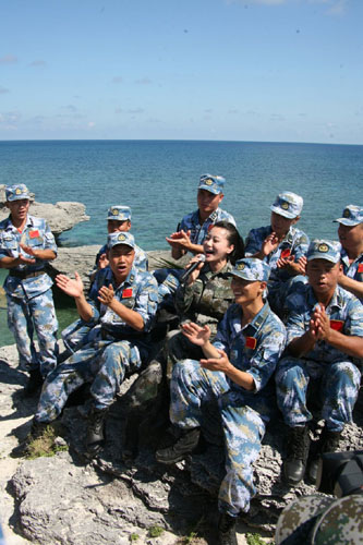 谭晶放歌西沙暖人心 与众人合影乐坏黑脸兵哥(图)(7)