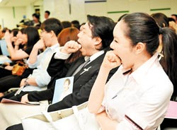 蔡康永和利菁(右)跟着台上吞拳头,为感伤气氛添增欢笑 图片来源:台湾“中国时报”