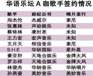 传统唱片公司EMI和华纳以前都有“天后宫”,网罗孙燕姿、蔡依林、萧亚轩等华语流行音乐天后,而早前蔡依林从EMI过档华纳时,签约仪式还是在鸟巢举行,风光操办大型记者会,但去年她约满华纳后,却没有了下家;此外张惠妹早已经离巢金牌大风,王力宏也早已经约满索尼唱片,这些华语乐坛的一线天王天后,大都处于没有唱片约的状态。A咖羽翼丰满后纷纷自立门户,唱片公司的处境就越发尴尬,这对歌手生存和音乐制作是利是弊?在流行音乐大环境越来越艰难的背景下,歌手和唱片公司都在转型,寻找新的合作方式。专题撰文 信息时报记者 丁慧峰