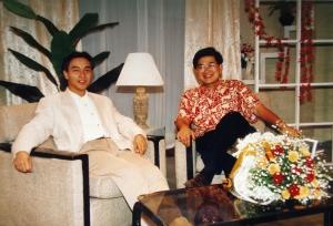 曹可凡(右)拿出当年采访张国荣时的合影。