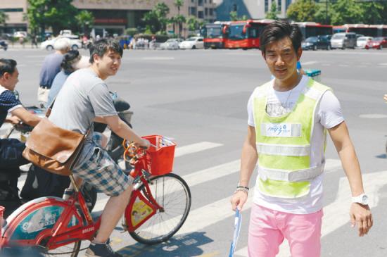 6月17日,歌手任贤齐在杭州出席“文明出行宣传月”活动,并在马路上当起了交通协管员,劝导行人遵守交通规则。(新华社发)