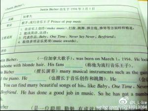 近日,知名娱乐博主“@顾剑”在自己的微博中晒出一张广州某中学的英语考题,这些试题中竟然出现了贾斯汀·比伯(注:当今美国流行乐坛最具影响力青少年歌手,被誉为“欧美乐坛近年流行音乐王子”)和吴亦凡(注:主攻华语地区的韩国男子偶像团体EXO-M的队长)。这两位明星的出现,不仅让许多学生眼前为之一亮,还有网友调侃,“要我做这个,妈妈再也不用担心我的学习了!”