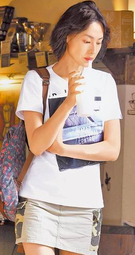 梁洛施拿着刚买的饮料准备上工,短裙之下一双美腿藏不住。图片来源:台湾“苹果日报”