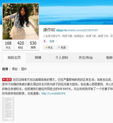 近日汪峰单方发出离婚信息的博文,已经严重影响到我的正常生活。消息发出后,家中不知情的亲戚长辈及周边好友对我与孩子的近况甚为担忧。在此真心感恩爱我、关心我的每位亲朋好友,也感谢我们曾经共同走过的6年半时光,无论如何我尽到了一个好妻子和好母亲所有的职责,没有遗憾。