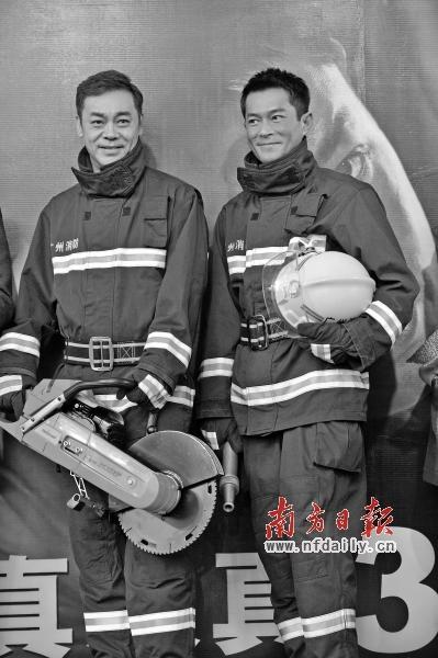 片中饰演一对消防员亲兄弟的刘青云和古天乐,昨日是身穿消防服、乘坐消防车,与北京真正的消防队员共同亮相现场的。已经合作了12年的二人不忘在发布会上相互调侃。