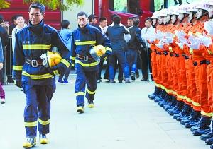 刘青云和古天乐身穿影片中的消防衣,在一排真正消防战士护送下来到现场,场面十分拉风。