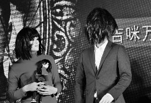 林峰(右)昨日在发布会现场戴上假发扮鬼。 信息时报记者 朱元斌 摄