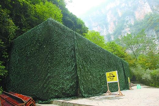好莱坞的制作团队注重细节还表现在,景区内的大小指示牌为了拍摄都已经拆放到一边,至于景区内平时标志最明显的洗手间,也在外面用一层类似树叶藤蔓的绿色塑料网罩住,与背后的山石植被完全融为一体。