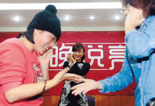 在新片《我爱的是你爱我》中,王珞丹和张涵予一段边唱着经典老歌《友谊花开万里香》,边互相敬礼、扇耳光的剧情,既搞笑又有爱——歌是大叔爱的老歌,但游戏形式却流露出属于小妞的活泼。这段戏极受“丹磁”们的喜爱,以90后为主的他们不仅把这首老歌唱得滚瓜烂熟,更把它戏称为“耳光歌”。昨日本报做客活动的最高潮,就是王珞丹挑选两对“丹磁”现场表演,而她则在身后唱起这首活泼的“耳光歌”。得知王珞丹亲自参与这个环节,现场“丹磁”们却有些腼腆,王珞丹却对两组选手们说:“别羞涩嘛!你们靠我近一点!”贴心的王珞丹还特意讲了一遍规则:“石头剪子布,出一样的敬礼,赢了的打输了的——只能打手捂的那面,别太用力哦!”