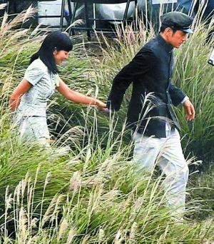 金城武(右)牵着长泽雅美快步穿越芒草丛。