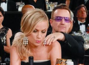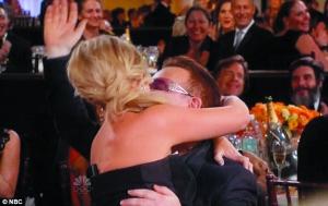 艾米·波勒在台下也搞笑,U2乐队主唱波诺帮她按摩,她则马上狂吻波诺。