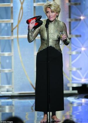 艾玛·汤普森光脚上台颁奖,她拿着酒杯装喝醉。