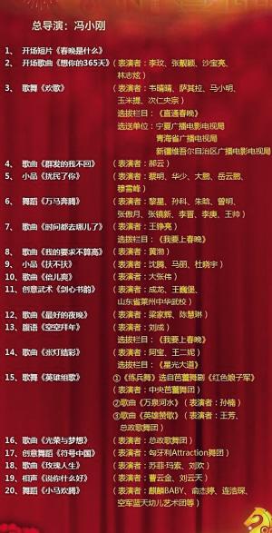 昨天晚些时候,春晚节目单尘埃落定并正式公布,颠覆性的以《春晚是什么》开场,始终如一的《难忘今宵》收尾。刘欢+苏菲·玛索的《玫瑰人生》;李敏镐+庾澄庆《情非得已》;华晨宇等4位新生代歌手春晚首秀。其中语言类节目仅有5个。李玟、张靓颖、沙宝亮、林志炫献唱开场歌曲《想你的365天》,成龙表演创意武术,姚贝娜将在零点跨年演唱。