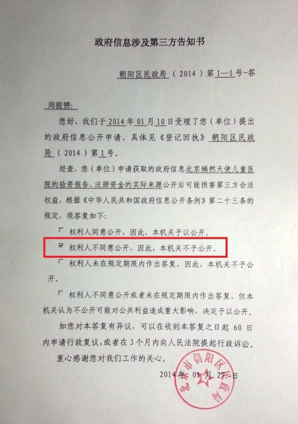 上一页 举报人:卫生局、民政局拒公开嫣然医院验资报告(3)